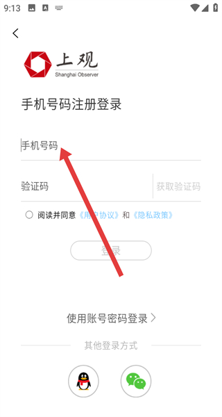 3、在手機號碼注冊登錄界面,輸入手機號碼,勾選閱讀并同意《用戶協(xié)議》和《隱私政策》。