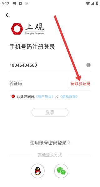 4、填寫好手機號后,點擊獲取驗證碼,輸入收到的短信驗證碼,即可完成賬號登錄操作。