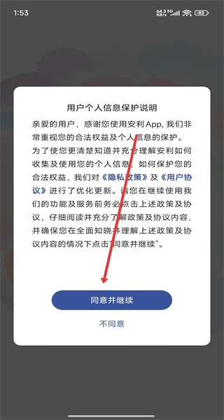 1、可以通過點擊個人信息保護(hù)說明彈窗中的同意并繼續(xù)按鈕,進(jìn)入App中開始使用。