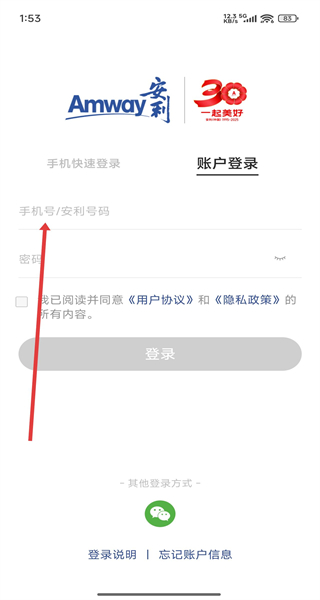 3、在賬戶登錄界面中,可以點擊下方輸入框填寫手機號和密碼信息,進(jìn)行登錄操作。