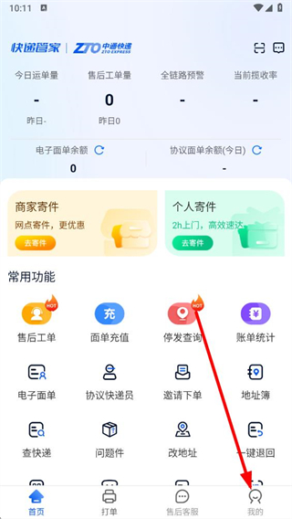 1、在中通快遞app首頁(yè)點(diǎn)擊我的選項(xiàng),進(jìn)入個(gè)人頁(yè)面。