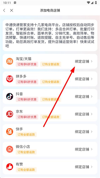 4、在頁(yè)面中選擇要綁定的電商平臺(tái),點(diǎn)擊對(duì)應(yīng)的綁定店鋪按鈕,按照提示完成店鋪綁定操作。