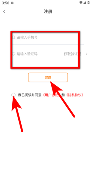 4、在注冊(cè)界面,填寫手機(jī)號(hào)驗(yàn)證碼,勾選協(xié)議后點(diǎn)擊完成,完成注冊(cè)操作。