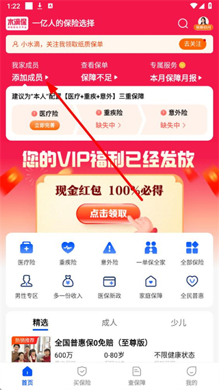1、在水滴保首頁,找到添加成員選項,點擊進入我的家庭保障頁面。