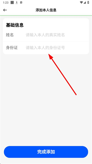 4、在添加本人信息頁面,輸入真實姓名和身份證號,點擊完成添加按鈕即可。