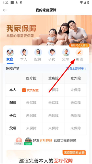 2、在我的家庭保障頁面,找到編輯按鈕,點擊進入家庭成員管理頁面。