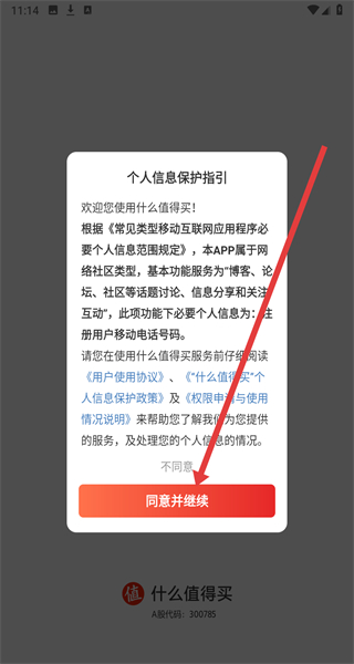 1、點擊“個人信息保護指引”彈窗的“同意并繼續(xù)”,進入“什么值得買”主界面。