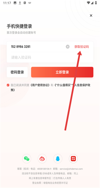 3、在登錄頁面輸入手機號碼,點擊“獲取驗證碼”。