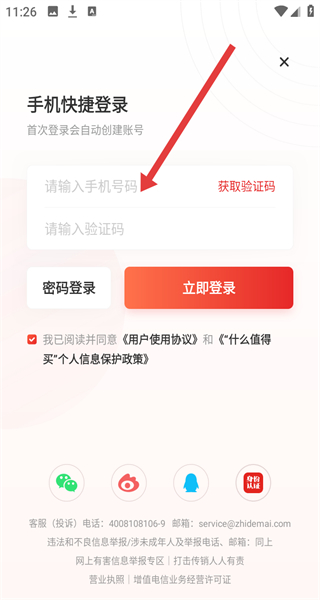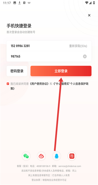 4、輸入收到的短信驗證碼,點擊“立即登錄”按鈕,完成賬號登錄首次登錄會自動創(chuàng)建賬號。