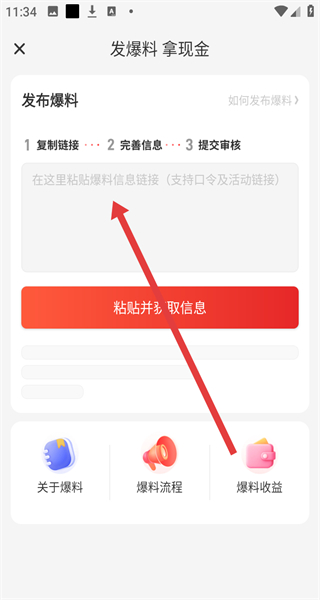 4、發(fā)爆料頁面在鏈接輸入框粘貼爆料信息鏈接,按提示完成后續(xù)操作。