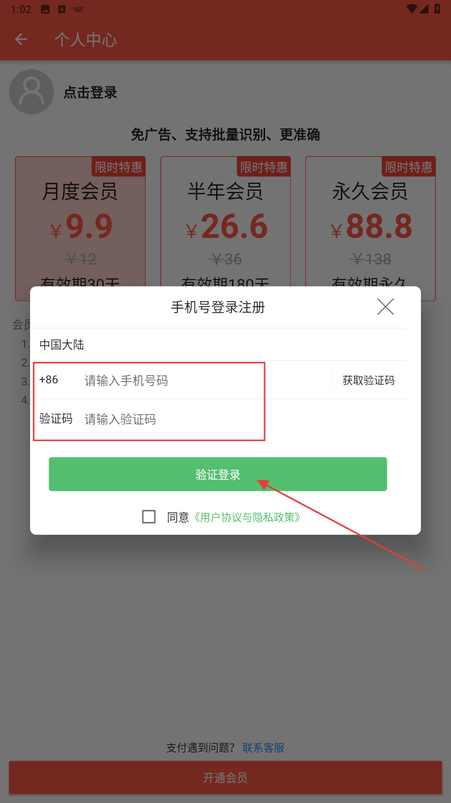 4、點(diǎn)擊后,會(huì)彈出手機(jī)號(hào)登錄注冊(cè)的方式,在輸入框輸入手機(jī)號(hào)、驗(yàn)證碼,再點(diǎn)擊驗(yàn)證登錄即可。