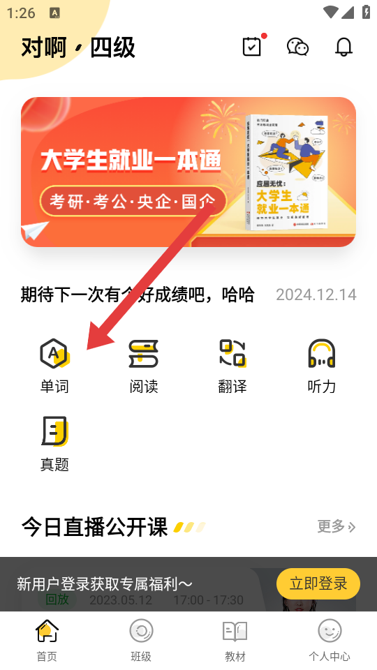 1、在首頁點擊單詞,進(jìn)入背單詞板塊,可開始四級高頻詞的學(xué)習(xí)。