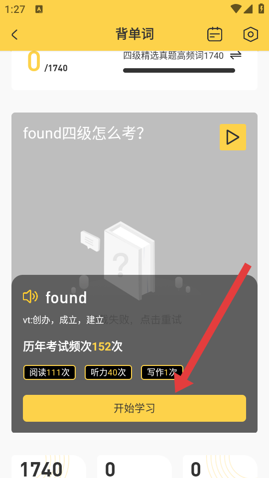 2、在背單詞的頁面,需要點擊開始學(xué)習(xí),進(jìn)入單詞學(xué)習(xí)的流程。