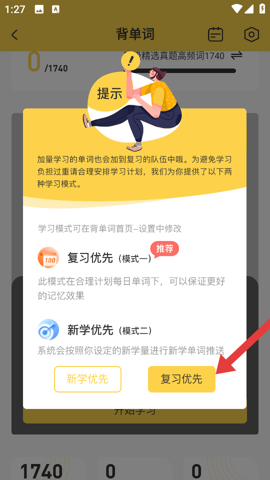 3、在選擇彈窗中,可以選擇復(fù)習(xí)優(yōu)先,制定適合自己的學(xué)習(xí)計劃。