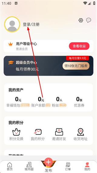 2、在我的頁面中,找到并點擊登錄/注冊區(qū)域。