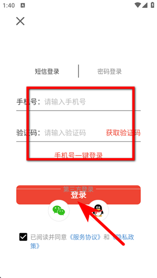4、在短信登錄頁(yè)面,輸入手機(jī)號(hào)和驗(yàn)證碼后點(diǎn)擊登錄,即可完成登錄操作。