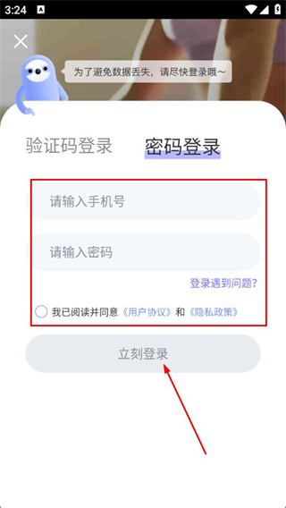 3、輸入手機號、密碼,勾選協(xié)議,點擊立刻登錄。