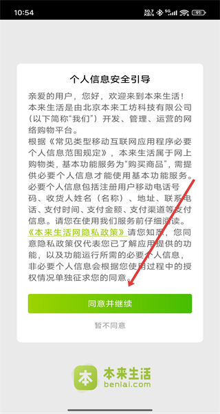 1、點擊“同意并繼續(xù)”,進入本來生活首頁。