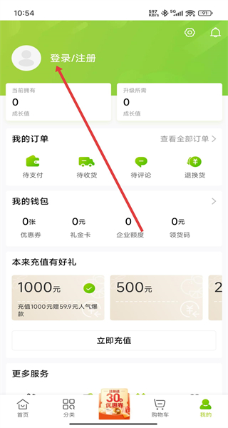 3、在個人中心頁面點擊“登錄/注冊”,進入登錄頁面。