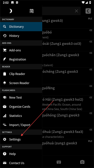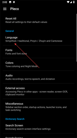 3、進(jìn)入設(shè)置頁面后,點(diǎn)擊Language選項(xiàng),進(jìn)入語言界面pleco怎么設(shè)置為粵語。