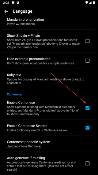 4、勾選Enable Cantonese選項(xiàng),即可將Pleco設(shè)置為粵語。