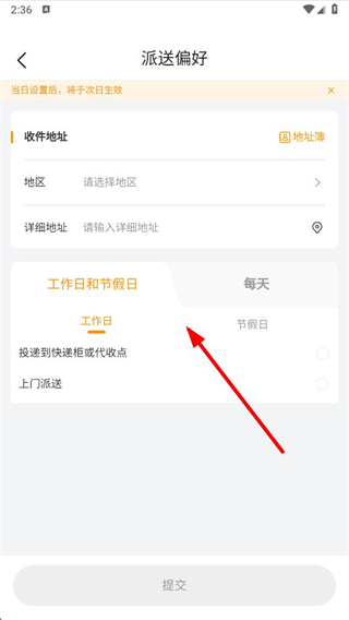 4、在界面選擇地址、派送時間工作日或節(jié)假日等,點擊提交即可完成郵政EMS派送時間設置。