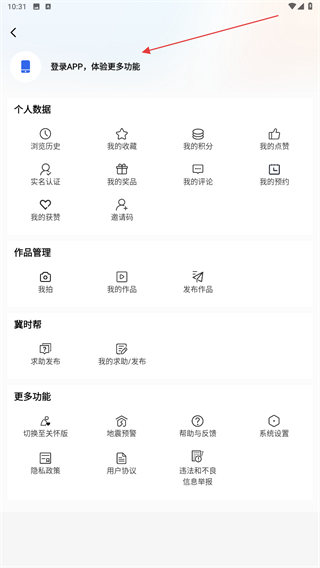 2、進入個人主頁內(nèi),點擊上方登錄APP,體驗更多功能的區(qū)域。