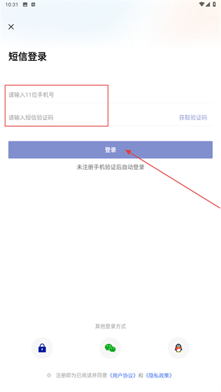 3、在短信登錄的界面內(nèi),輸入手機號、驗證碼,再點擊登錄即可。