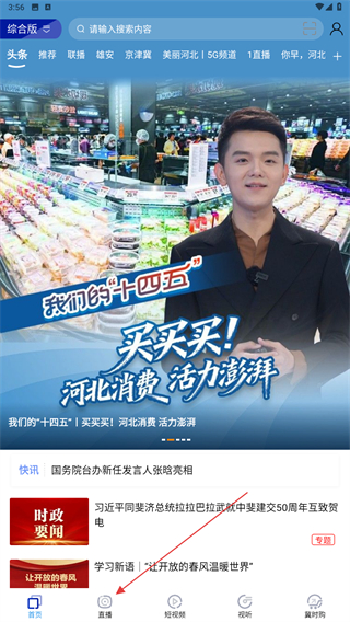 1、打開河北廣播電視臺APP,進入首頁點擊直播的標簽。
