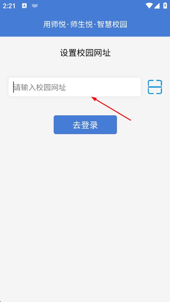 2、在設置校園網址頁面,點擊輸入框,可選擇手動輸入校園網址,也可點擊右側掃碼圖標,進入掃碼頁面掃碼獲取校園網址。