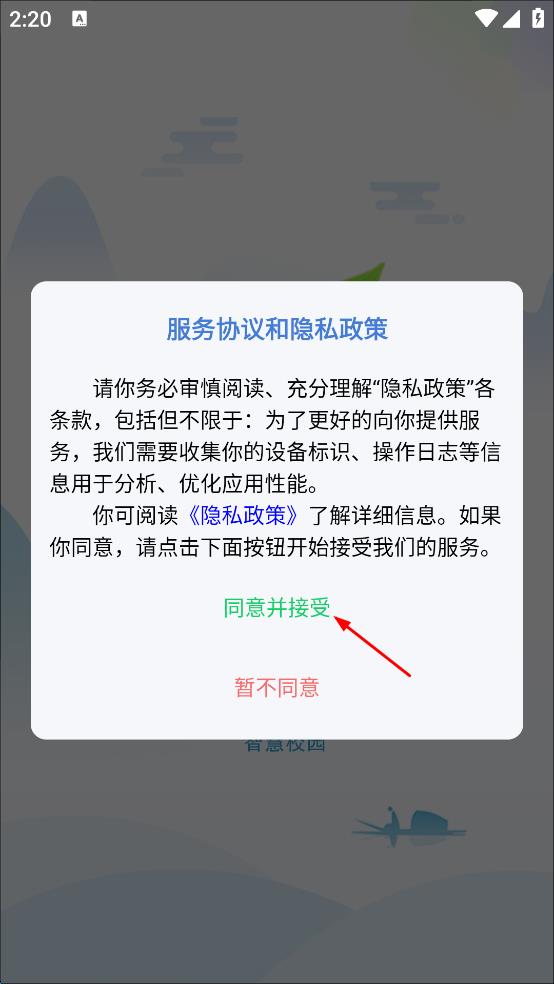 1、打開師悅智慧校園APP,會彈出服務協議和隱私政策頁面,仔細查看內容后,點擊“同意并接受”按鈕,進入設置校園網址頁面。