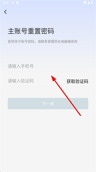 4、在主賬號(hào)重置密碼頁(yè)面,輸入手機(jī)號(hào)和驗(yàn)證碼,點(diǎn)擊下一步按鈕,按提示完成密碼重置操作。