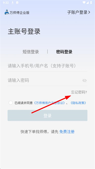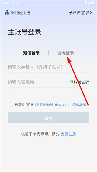 1、在萬(wàn)師傅歡迎頁(yè)面,點(diǎn)擊立即登錄按鈕,進(jìn)入主賬號(hào)登錄頁(yè)面。