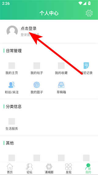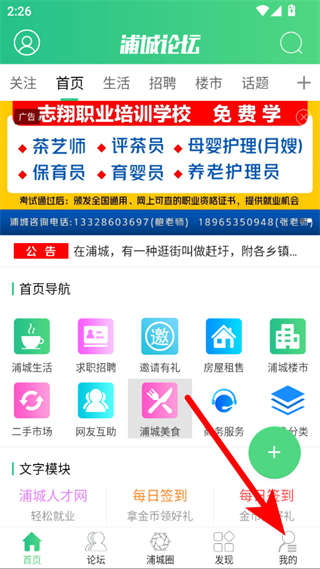 1、打開浦城論壇APP,點擊右下角我的,進入個人中心頁面。