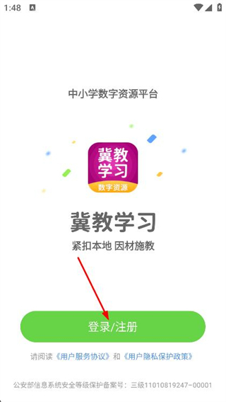 1、打開(kāi)冀教英語(yǔ)app,點(diǎn)擊下方的登錄/注冊(cè)按鈕。