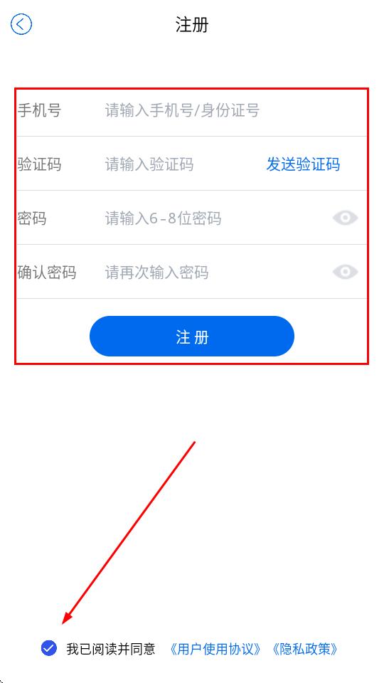 4、在注冊頁面,輸入手機(jī)號、輸入驗(yàn)證碼,設(shè)置密碼,再次確認(rèn)密碼,勾選我已閱讀并同意用戶使用協(xié)議隱私政策,點(diǎn)擊注冊。