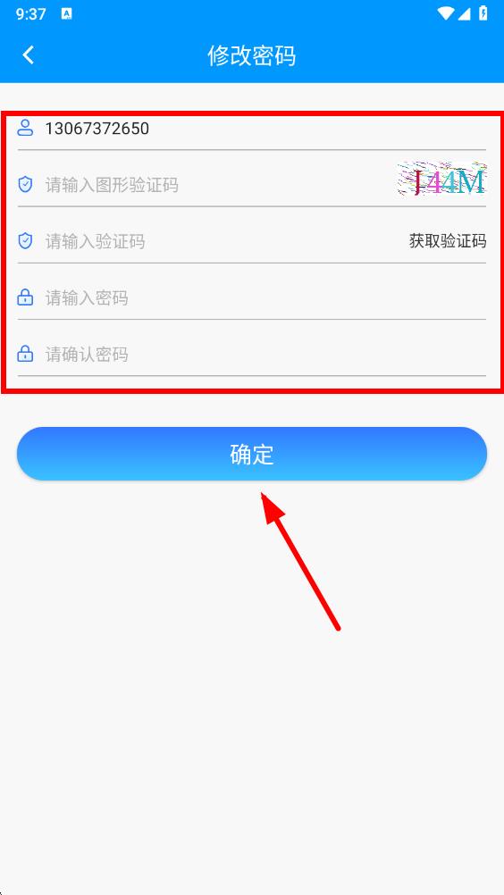 5、在修改密碼頁面,按要求輸入圖形驗(yàn)證碼、獲取并輸入驗(yàn)證碼,設(shè)置新密碼并確認(rèn)密碼,最后點(diǎn)擊確定即可完成密碼修改。