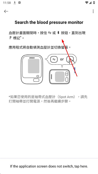 3、按照提示在血壓計開機時按住特定按鈕直到出現(xiàn)P標記,自動偵測血壓計并完成連接,之后即可使用APP記錄和管理健康數(shù)據(jù)。