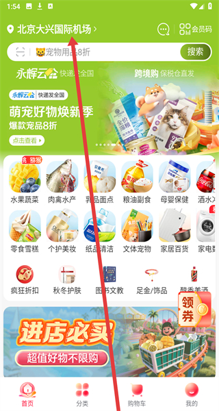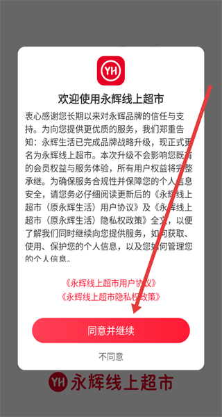 1、在永輝線上超市的“服務(wù)協(xié)議及隱私政策”彈窗點(diǎn)擊“同意并繼續(xù)”,進(jìn)入主界面。