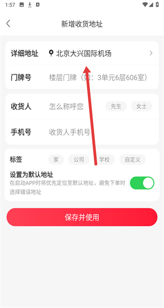 4、在新增收貨地址頁(yè)面依次填寫詳細(xì)地址、門牌號(hào)、收貨人、手機(jī)號(hào)等信息,完成后點(diǎn)擊“保存并使用”,即可完成收貨地址的新增操作。
