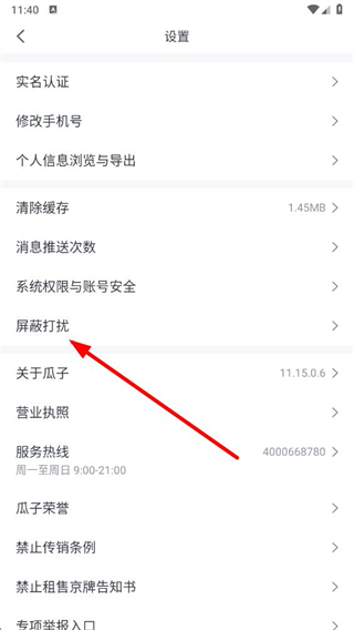 3、在設置界面中,找到屏蔽打擾選項并點擊,進入開通免電話打擾頁面。