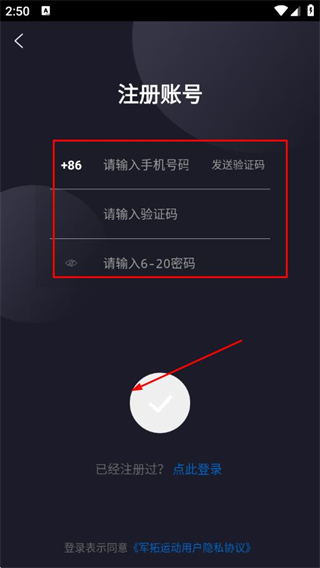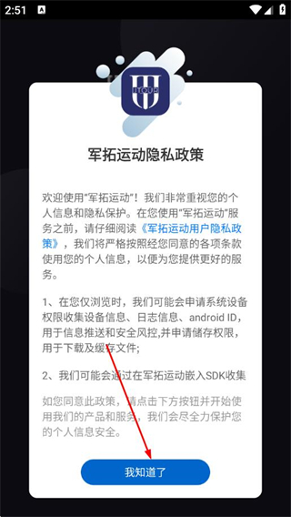 1、打開軍拓運(yùn)動(dòng)APP,在隱私政策頁面點(diǎn)擊我知道了。