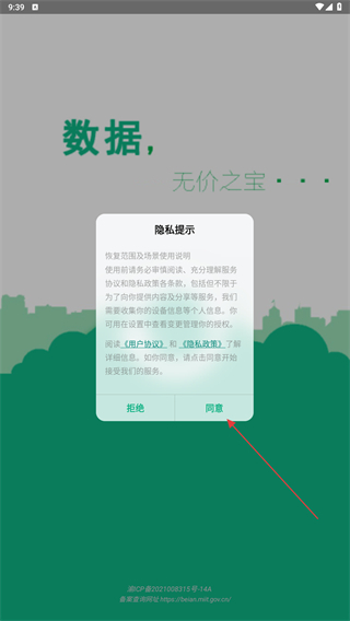 1、啟動(dòng)手機(jī)照片恢復(fù)APP,進(jìn)入時(shí)會(huì)彈出隱私提示,點(diǎn)擊同意的按鈕。