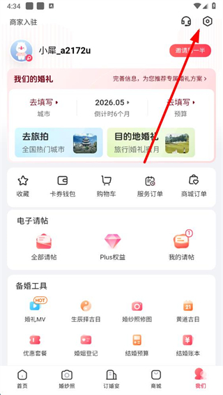 1、打開婚禮紀(jì)app,在我們頁面點(diǎn)擊右上角設(shè)置圖標(biāo)。