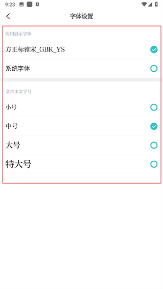 4、在字體設置頁面可選擇應用展示字體還可選擇文章正文字。