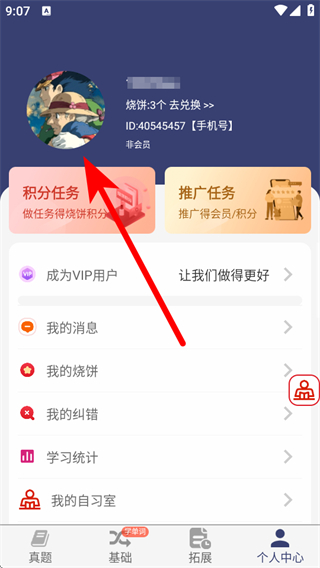 1、打開(kāi)燒餅日語(yǔ)APP,點(diǎn)擊個(gè)人中心,進(jìn)入個(gè)人頁(yè)面。