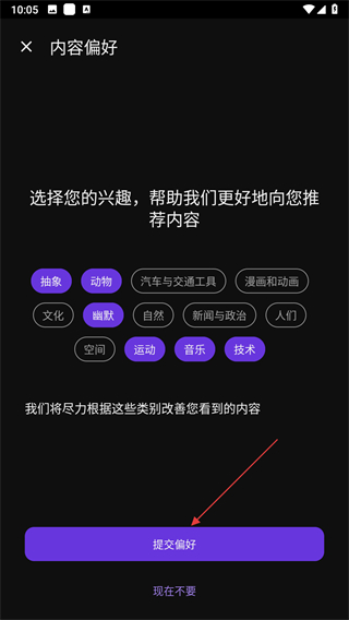 4、選好感興趣的類別后,點(diǎn)擊提交偏好,即可完成內(nèi)容偏好的設(shè)置。