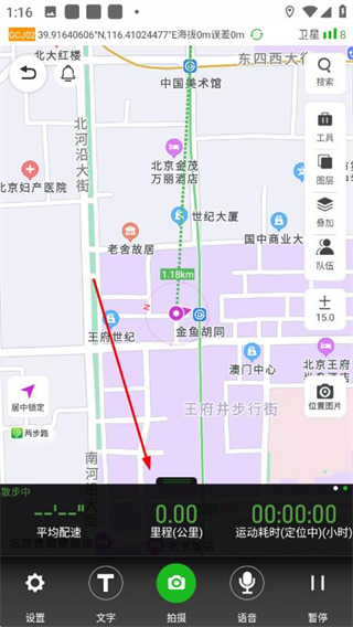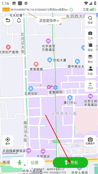 5、開始導(dǎo)航后,可查看里程、運動耗時等實時數(shù)據(jù),利用右側(cè)工具、圖層、隊伍等功能輔助出行。