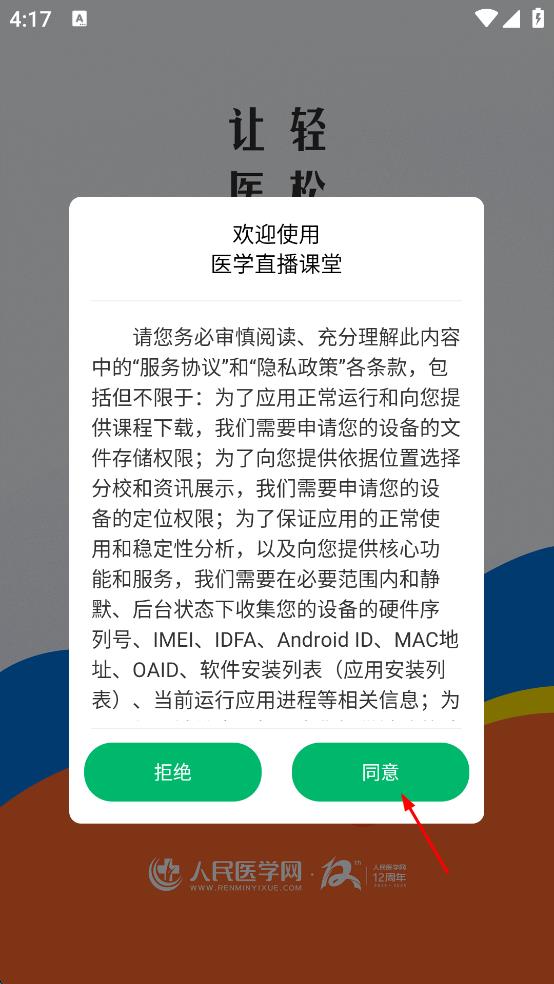 1、打開(kāi)醫(yī)學(xué)直播課堂App,在歡迎使用頁(yè)面,點(diǎn)擊“同意”按鈕。