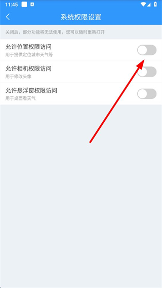 4、在系統(tǒng)權(quán)限設(shè)置頁(yè)面,點(diǎn)擊允許位置權(quán)限訪問(wèn)右側(cè)的開(kāi)關(guān),將其打開(kāi)即可開(kāi)啟定位權(quán)限。